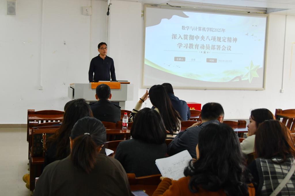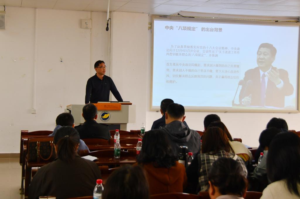 在明德楼103报告厅召开深入贯彻中央八项规定精神学习教育动员部署会议。学院领导、全体教职工参加会议,会议由学院党委书记龙俊主持。