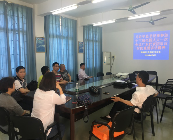 本次学习的主题是:深刻领会“习近平总书记在参加十三届全国人大一次会议广东代表团审议时的重要讲话精神”,做好物联网工程系教学科研工作。党支部书记朱旭东主任在主题发言中对习近平总书记重要讲话精神进行了解读,他说,大家要认真落实新时代党的建设总要求,努力把支部锻造得更加坚强有力,从各级领导干部做起,从一件件小事抓起,坚决防止不良风气反弹回潮,不断巩固和拓展落实中央八项规定精神成果。