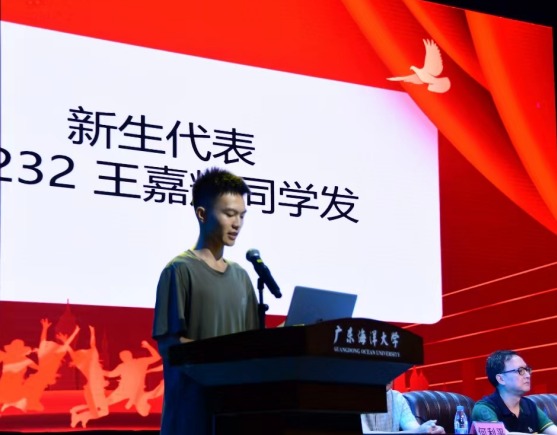刚从部队转业回校、数据科学与大数据专业1232班王嘉辉同学代表新生发言。他表示面对正在到来的大学生活,一定与全体新同学一道保持自律,抓住机遇,努力学习,勇担使命。